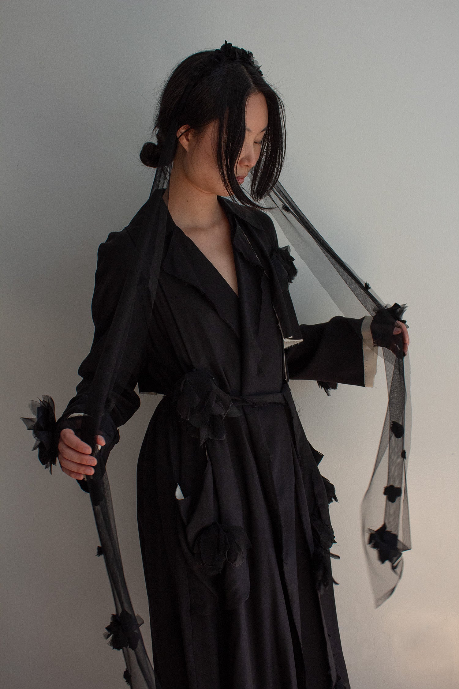 This is where each piece begins — among remnants of silk kimono, memory, and quiet work.